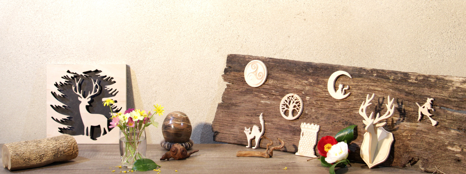 - Sujets en bois à poser ou accrocher (chouettes, loups, dragons...)